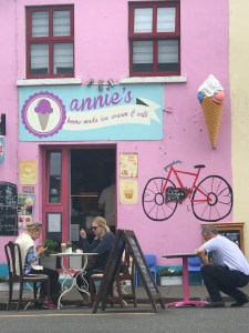Yet another gem offered by our tour guide, Dermott, was Annie’s homemade ice cream shop in Sneem. Dermott not only brought us to Annie’s; he also helped with some of the re-painting of the pink tables that Annie was doing when we arrived (that’s Dermott to the left…crouched down, he’s applying some beautiful pink paint to that table stand 😀 ).