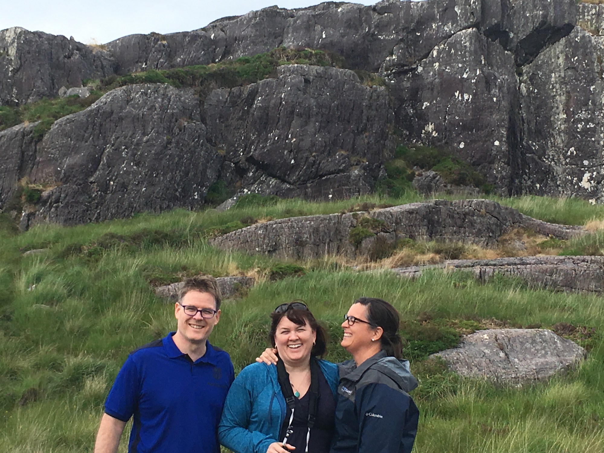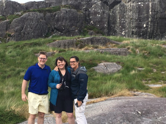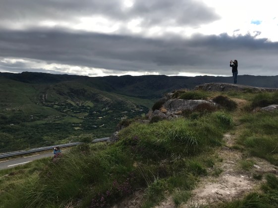 Sean wasn’t there as he had opted to hang in the bus while we galavanted above. Bernard objected to the rock behind us; he gave us running commentary about the rock background versus the vista foreground; why were taking a photo with a big rock in the background while on the Ring of Kerry, how it’d make more sense to use the vista as a background, etc etc. Ann and I were laughing, as was Minyoung, who patiently waited for us to pose while we giggled.