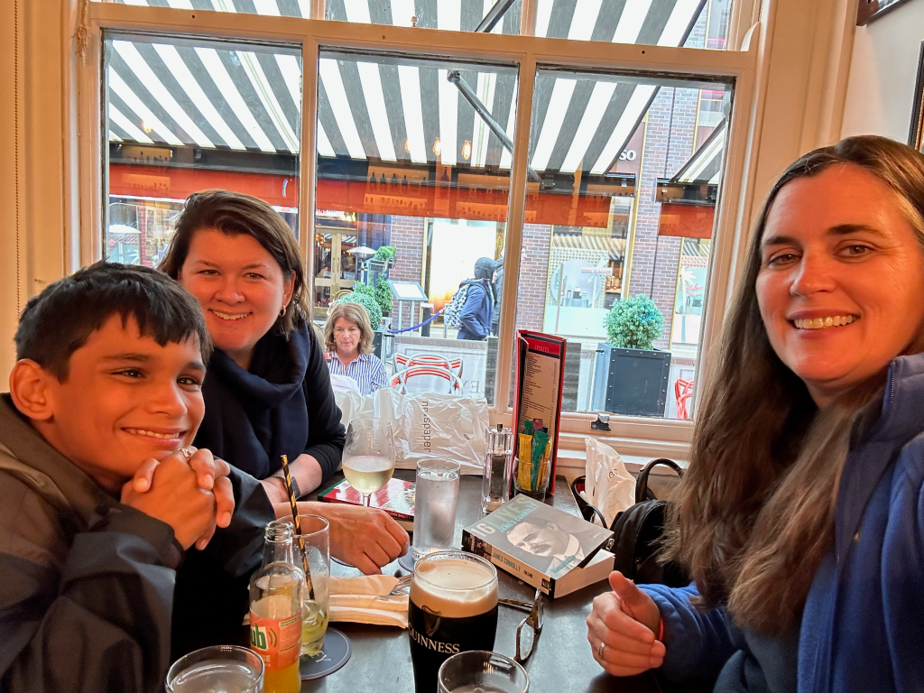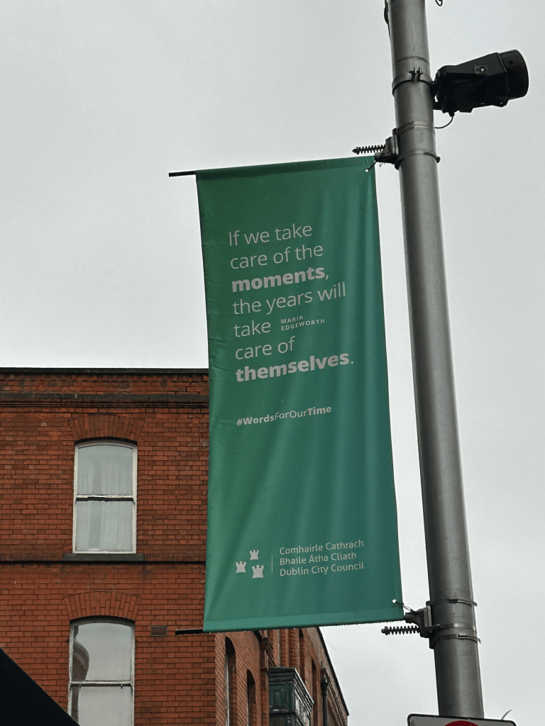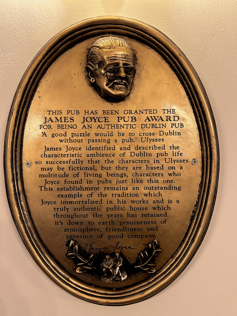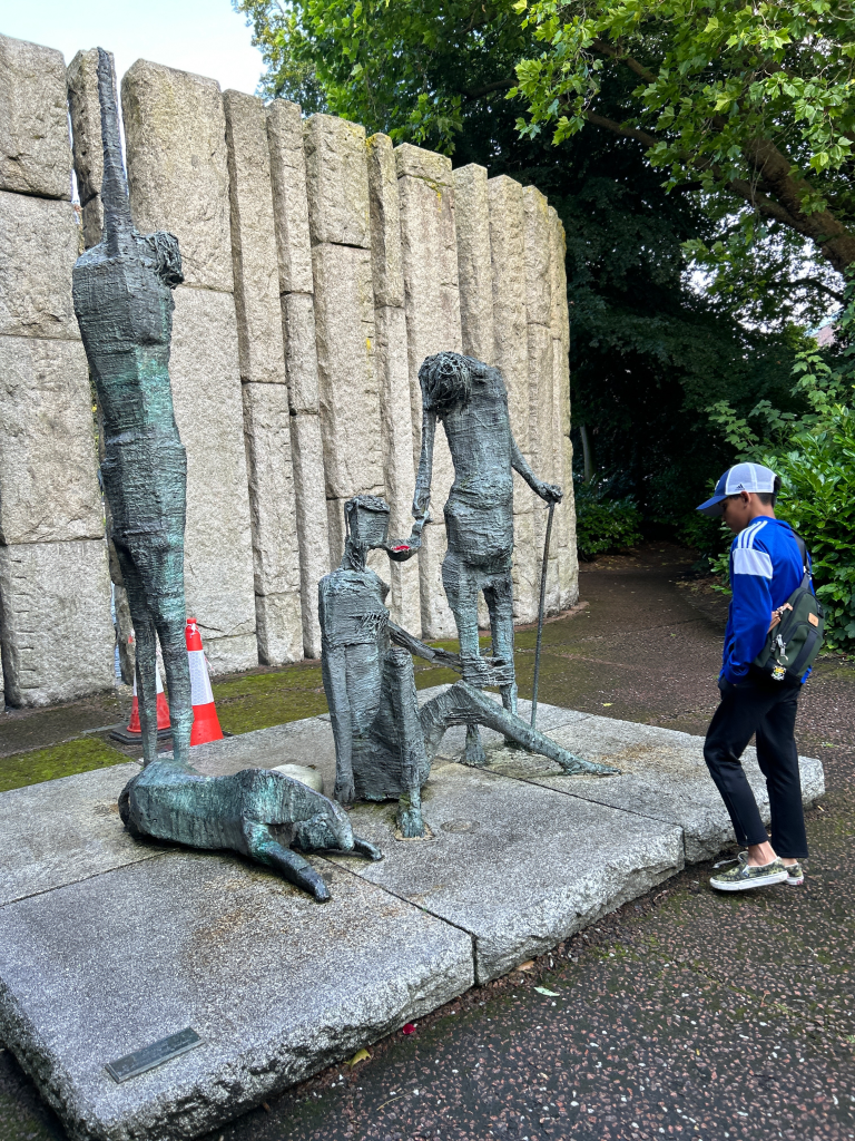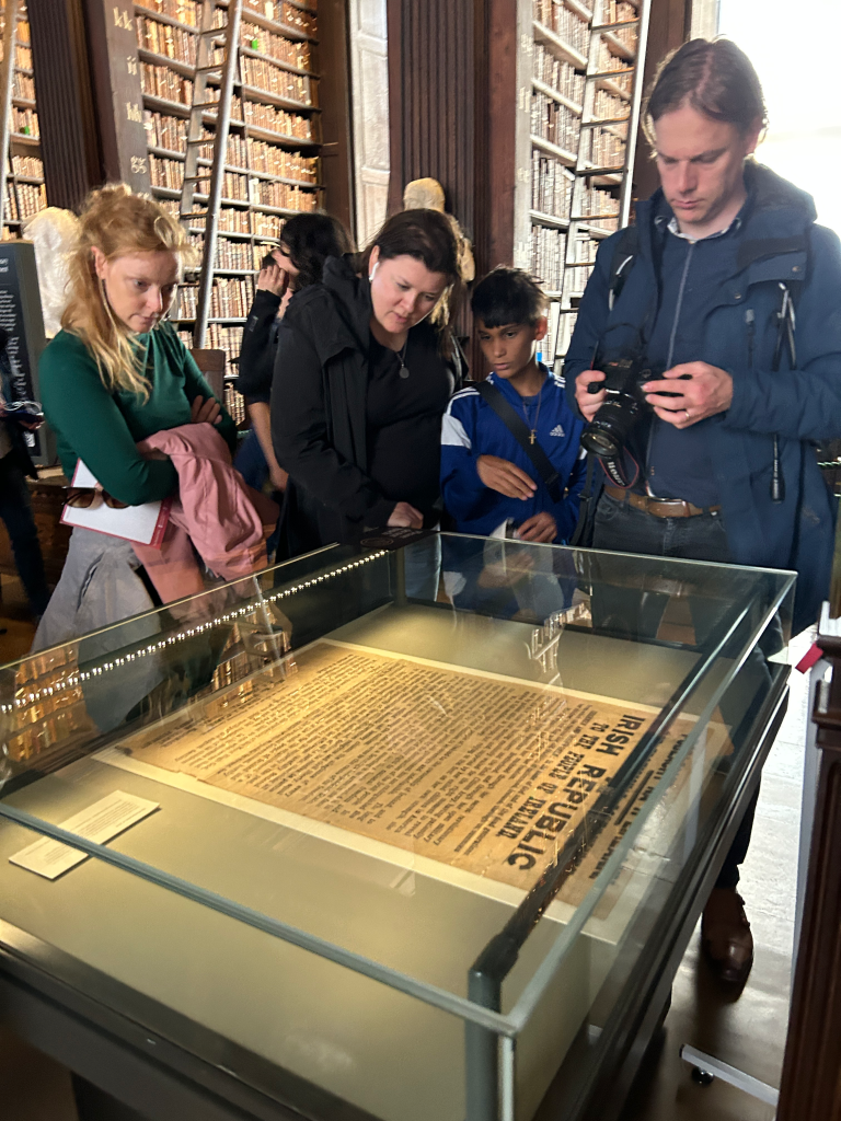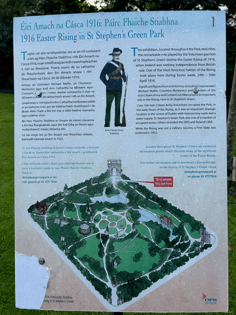 Hop-on, Hop-off tour where one of my highlights was learning of the light left on in the window at the President’s house, a nod to the Irish diaspora. Trinity College including the Book of Kells and the Library where an original copy of the 1916 Proclamation is kept, and St. Stephen’s Green which has historic significance in the 1916 Rising and also is now home to a beautiful and haunting memorials to the Famine and Irish heroes like Wolfe Tone.