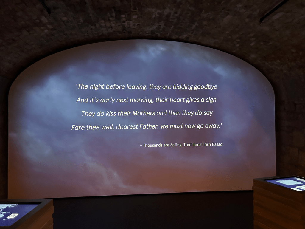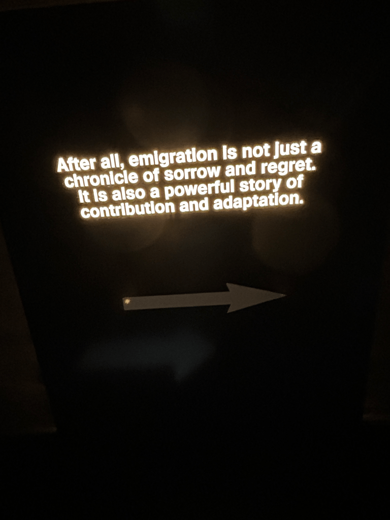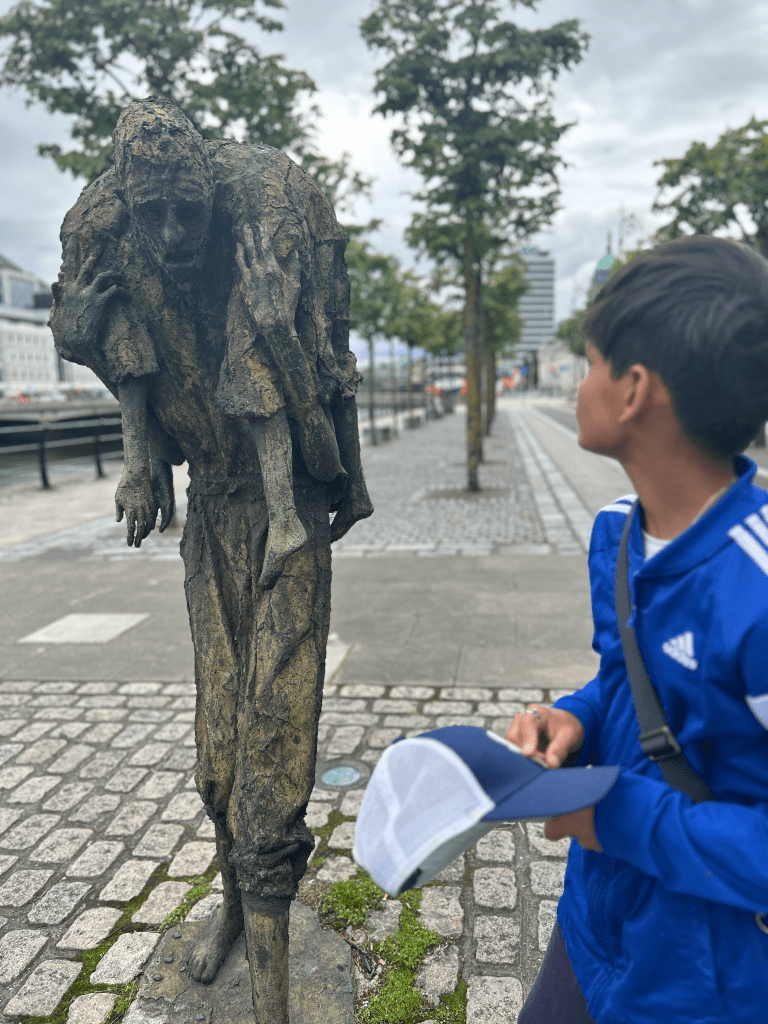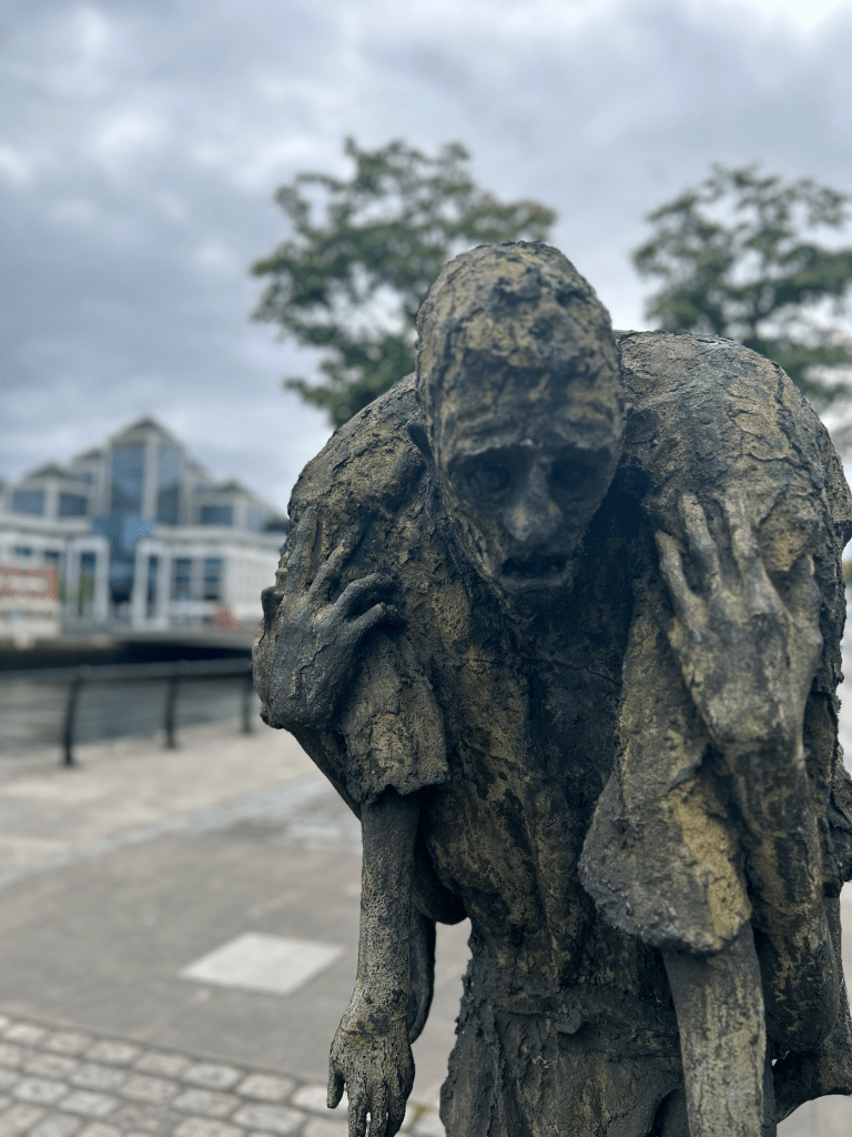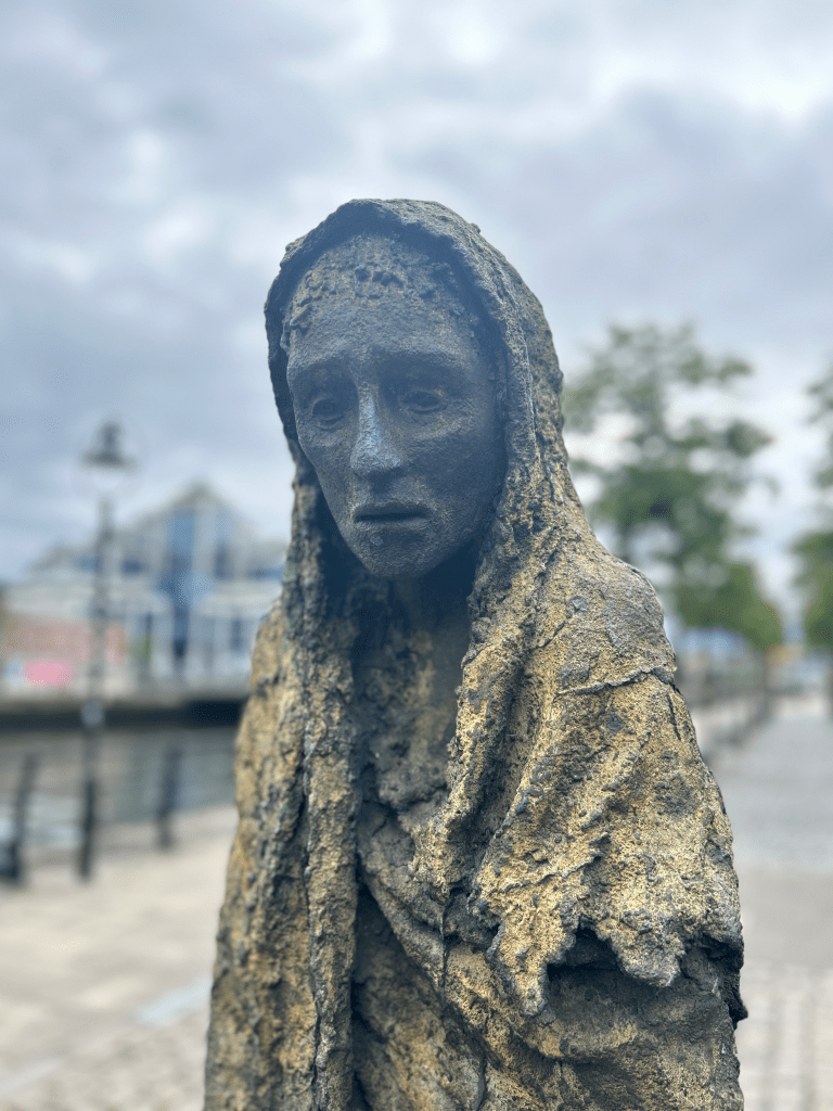 We took the bus back to Dublin City Center for a reserved lunch at Fish Shop. We then walked to EPIC Museum and came upon Famine, a 1997 sculpture memorializing the one million Irish who were forced to emigrate during The Great Hunger in the late 1840s. The figures are shown emaciated and in rags, carrying starving children on their backs and whatever belongings they could, towards a long journey to a foreign country. It was a stunning work. That we stumbled across it on the way to EPIC, which memorializes and celebrates Irish emigrants, made it all the more meaningful.