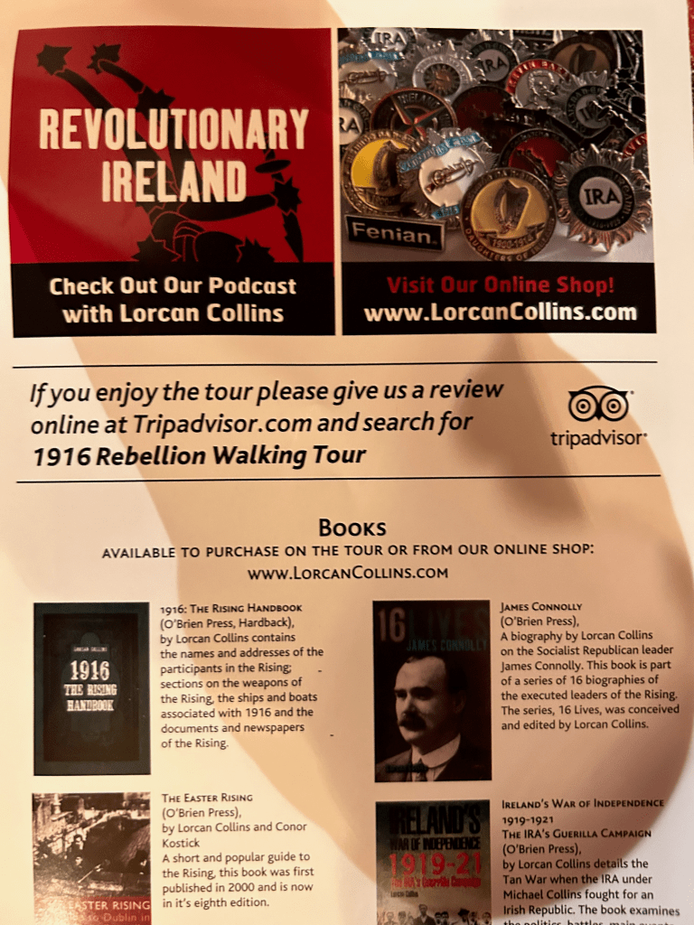 We had two excellent meals this day with a great walking tour sandwiched in between: the 1916 Rebellion Walking Tour, hosted by Lorkin Collins.