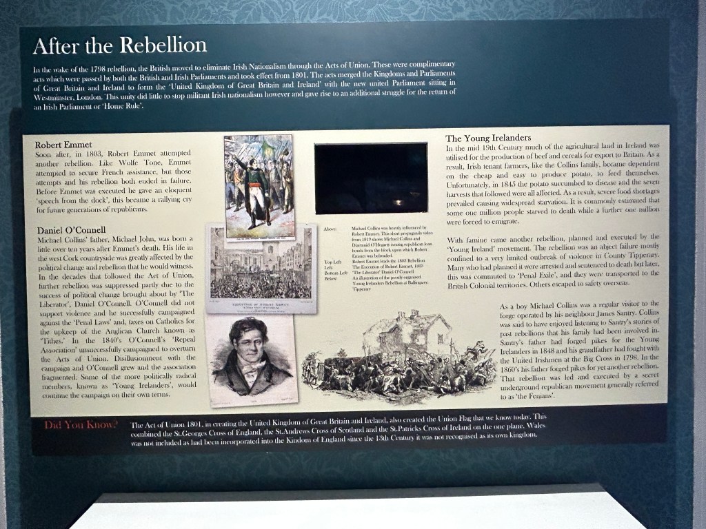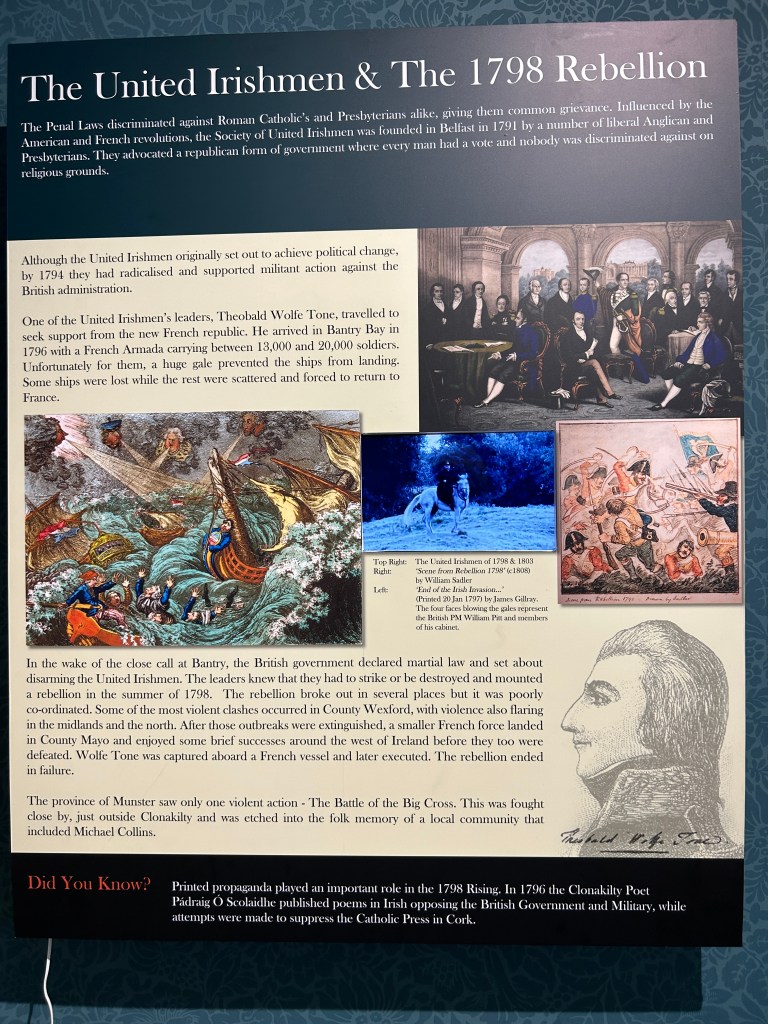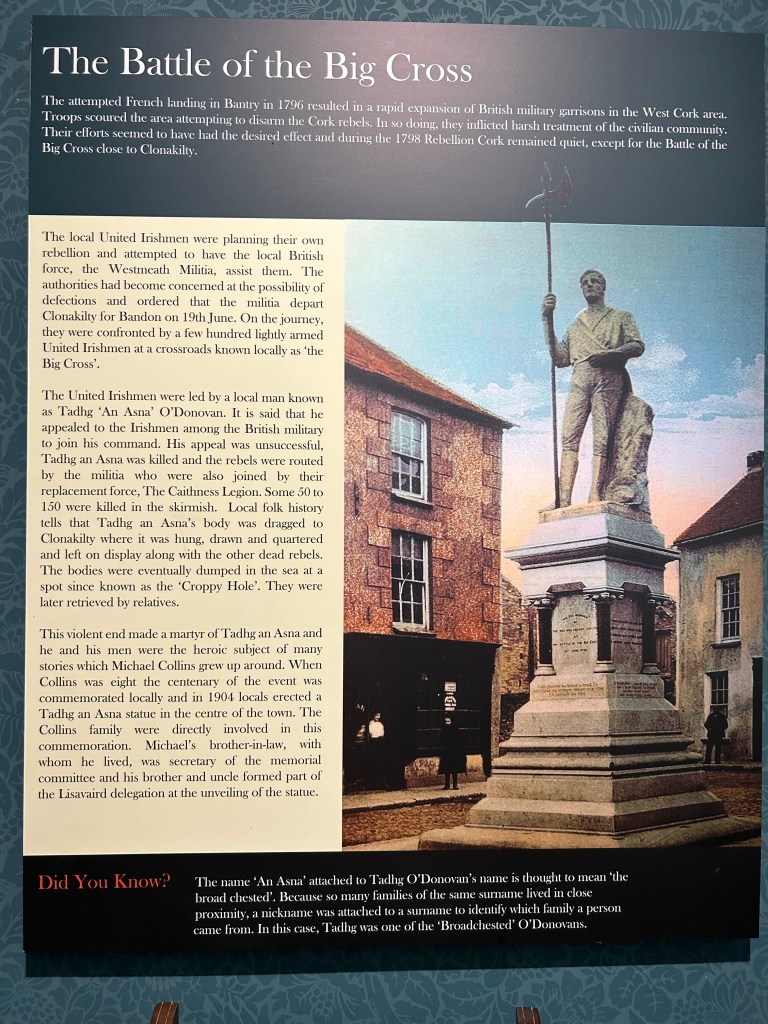 Another interesting note, this one from County Cork, was “The Battle of the Big Cross” which was close to where Michael Collins grew up in Clonakilty. We visited the Michael Collins House which is maintained by Irelands OPW, and that exhibit made note of the likely impact of The Battle of the Big Cross on a young Michael Collins and others growing up in early 20th century County Cork.