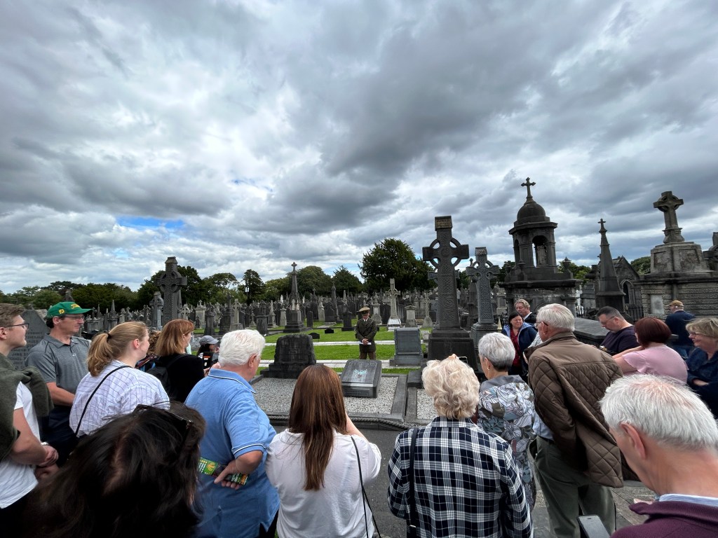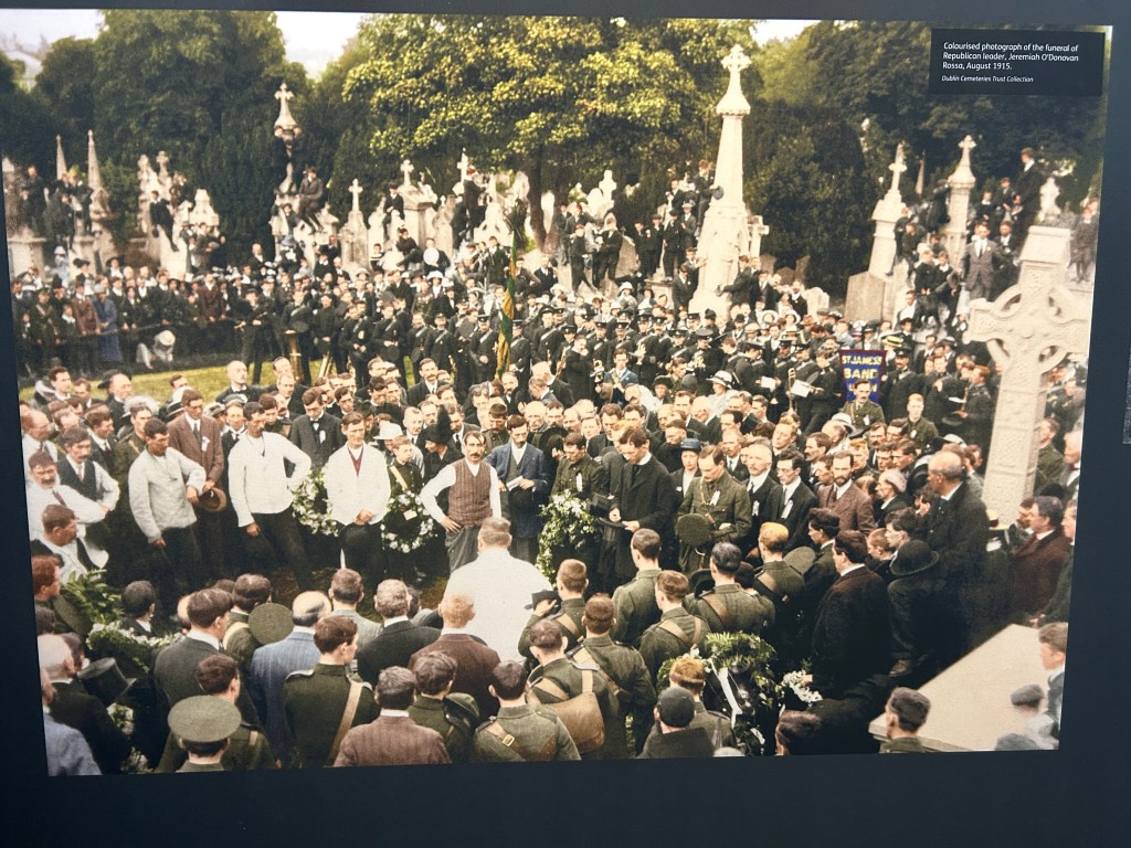 It was during this time that Jeremiah O’Donovan Rossa, a Fenian leader alongside Luby, was imprisoned and eventually forced to emigrate, ultimately landing in the United States. He would, as it was explained to us on the Glasnevin tour, work from Staten Island to raise funds for the IRB from abroad to support an 1867 uprising but it was crushed easily. O’Donovan Rossa would, however, play a final pivotal role upon his death, much later, in 1915; his body was sent home to Glasnevin for burial midway on August 6th, attended by thousands of mourners. That funeral was used as an organized event to catalyze support by the leaders of the next and last revolt, the 1916 Easter Rising. Each day at 2:30pm, a re-enactment is performed at Glasnevin of Patrick Pearse’s oration at O’Donovan Rossa’s funeral. The oration would prove to have similar last power and emotional punch as Robert Emmet’s speech on the dock, another echo through time. A funeral captures the funeral and several leaders of the 1916 Rising including Thomas Clarke and Patrick Pearse.