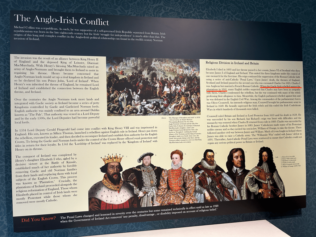 This was a revolt against the “plantation” system in Ireland. What follows from 1649 to 1653 is Oliver Cromwell’s campaign to forcibly take large swaths of Irish land. “Penal laws” are then enacted to deny Catholics the ability to gain political power in Ireland.